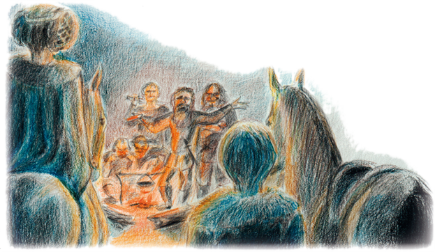 Так они выехали на небольшую поляну, посреди которой горел костёр. Над огнём висел серый котелок, в котором что-то уютно фыркало и кипело. А вокруг сидели люди в тёмных поношенных одеждах.