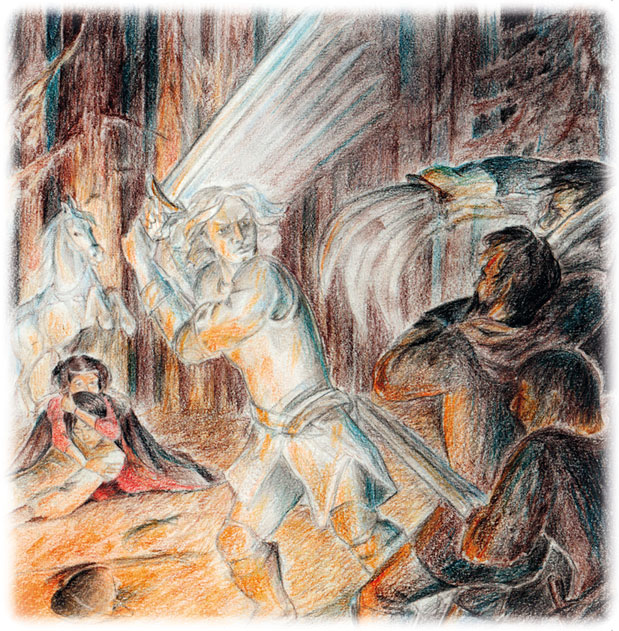 – Вы, кажется, хотите что-то от меня скрыть, – заметил Белый Рыцарь, спешиваясь. – Здесь явно кто-то звал на помощь. – И он направился в ту сторону, откуда слышал крик девушки. Несколько разбойников, обнажив мечи, преградили ему путь.