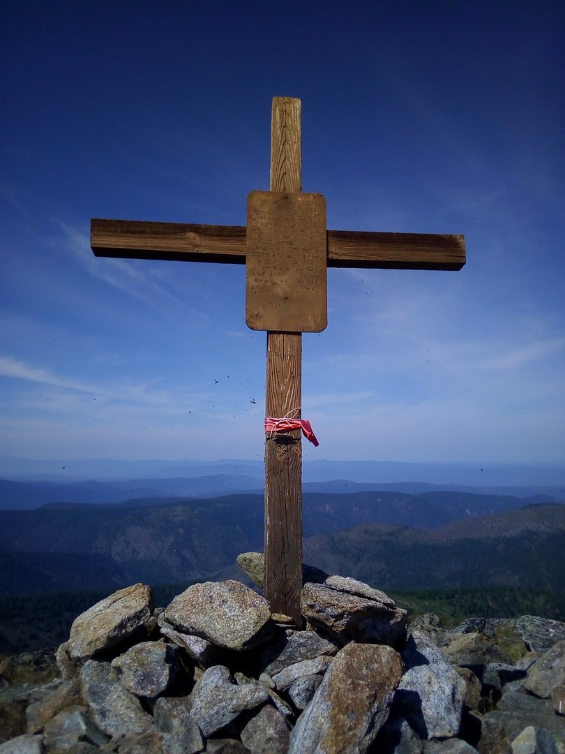 Последний рывок по камням и тросам – и далёкий крест на горе прямо передо мной. Вокруг – горы. Бескрайнее пространство, тишина и величие природы. Тропы на другие пики, но мне они сейчас ни к чему, меня устраивает вариант для новичков. Более чем устраивает, я в восторге! Если бы не облака, там, далеко, то был бы виден даже Байкал.