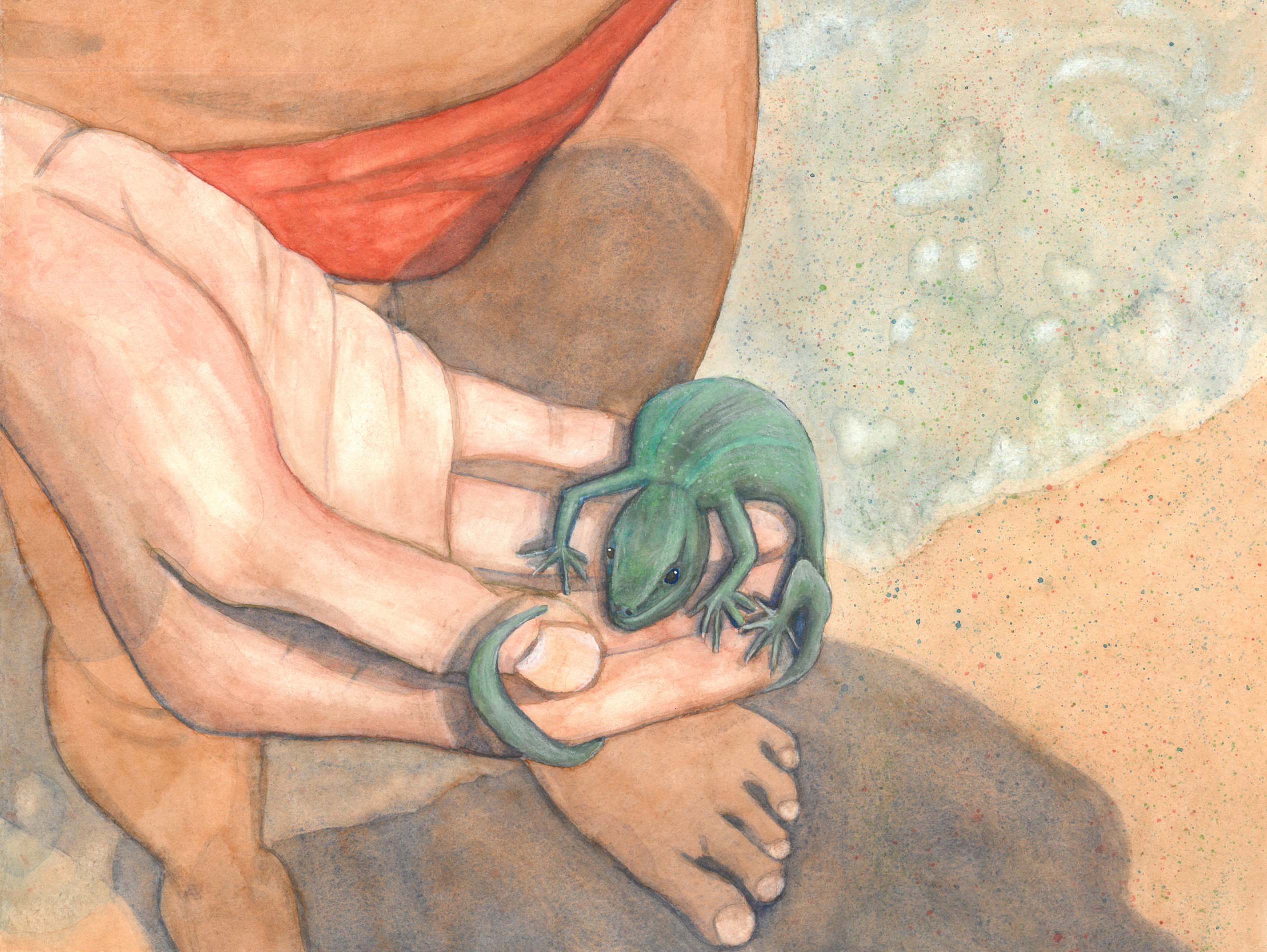 Розовая панама и рыжая кепка медленно поползли по песку поближе к камышам, где на камушке грелась очень красивая изумрудного цвета ящерица. Заметив две приближающиеся к ней тени, ящерица не стала долго раздумывать, а юркнула в камыши. След ее простыл.