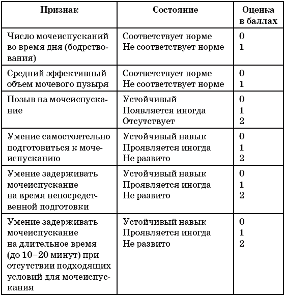 Оценить степень зрелости функции мочеиспускания поможет табл. 6, помещенная ниже. Она разработана группой авторов под руководством Е. Л. Вишневского. По сумме баллов можно судить о степени отклонения от нормы. Сумма, равная нулю, соответствует зрелому типу мочеиспускания.
