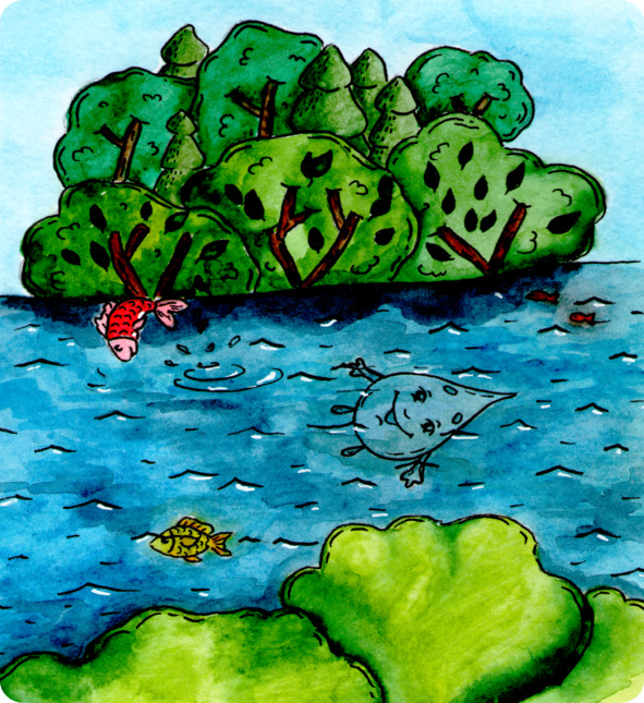 Капелька плыла на листочке по воде и думала о том, как бы ей набраться смелости и прыгнуть в ручей.