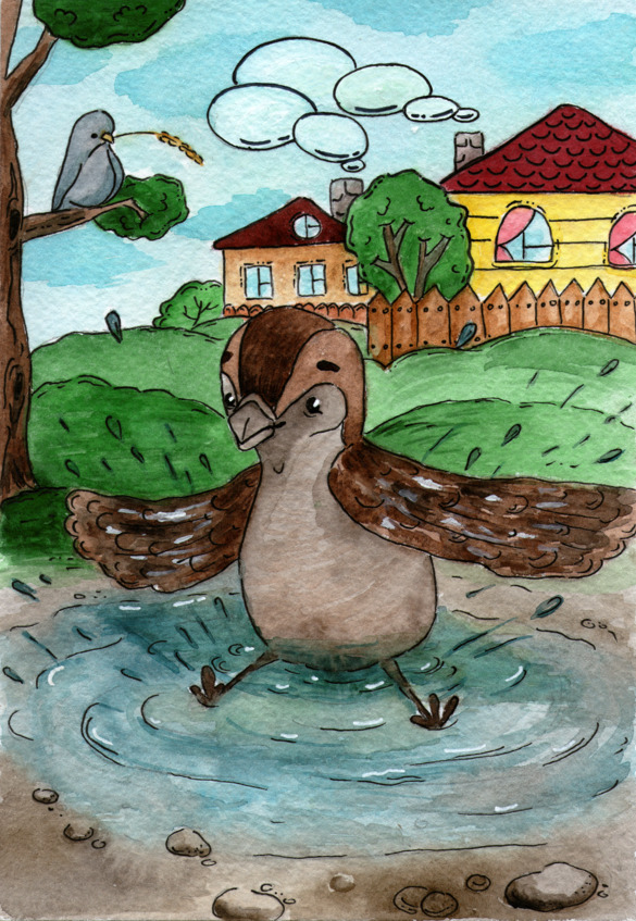 Он был очень любопытной птичкой и целыми днями напролет резвился в теплых летних лужицах. Он летал по окрестностям и звонко чирикал.