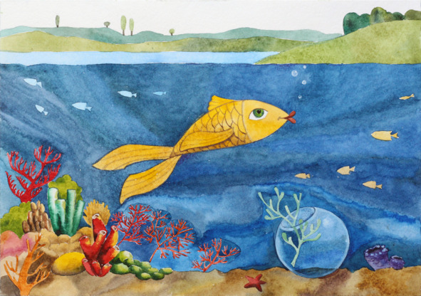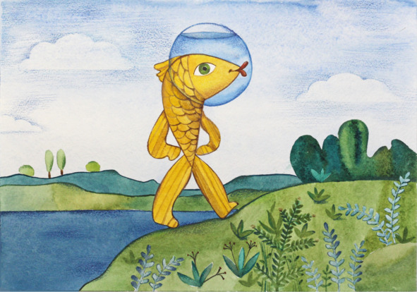 Чтоб дышать могла на суше,Ей аквариум был нужен.Подготовилась онаИ со дна его взяла.Шаг на берег, и теперьСухопутный рыба зверь.
