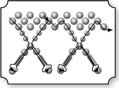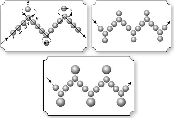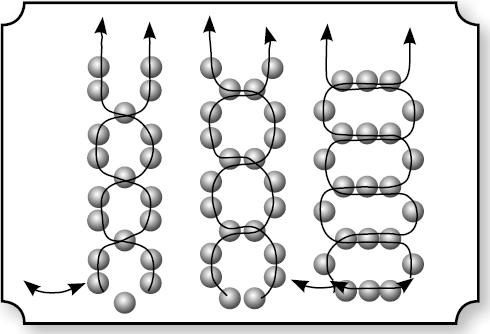 Вариантов соединения цепочек очень много. Их можно соединять по всей длине или через определенные промежутки, закрепляя нить, а затем вплетая ее вновь либо двигаясь через крайние бисерины цепочек и набирая на нить бисер, соединяющий ряды (рис. 32).