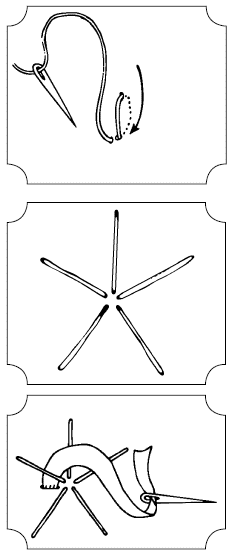 Когда лучей основы уже не будет видно, протащи ее на изнанку и закрепи. Отрезанные кончики ленты оплавь спичкой – тогда они не будут «сыпаться». Вокруг цветка вышей листья из узких зеленых ленточек. Шов, который идеально подходит для вышивания листьев розы, называется «петельки с прикрепкой сверху». Вот как он выполняется.