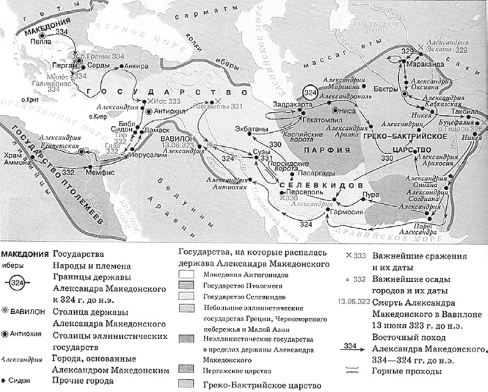 Карта империи Александра Македонского с важнейшими сражениями и их датами. Стрелками показано направление Восточного похода Александра