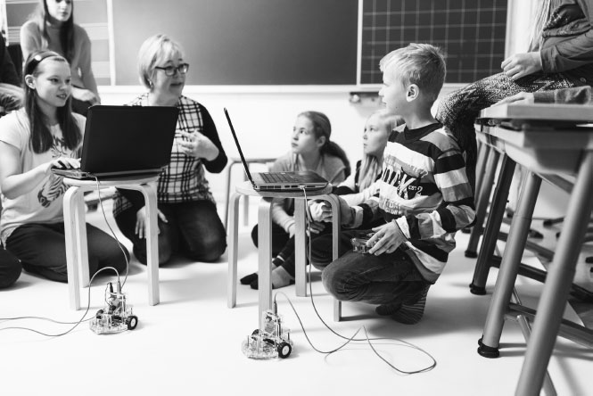 Рис. 2. Дети программируют устройства, собранные в прозрачных корпусах