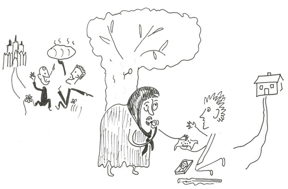 Долго ли, коротко ли шли братья, но устали и проголодались. Решили они остановиться в лесу и перекусить. Только уселись и начали есть, как появилась перед ними старушка c клюкой. Была она очень старая, голова её тряслась, а ртом она все время шамкала. Старушка сказала, что уже сто лет не было у неё во рту ни маковой росинки, и попросила у братьев немного хлебушка.