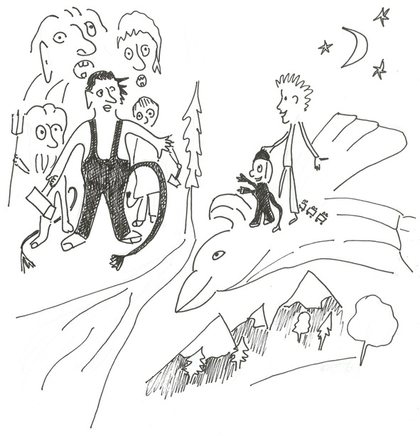 Пошли они вместе к ворону, который их поджидал. Посадил их ворон себе на спину и отнёс на своих крыльях на гору, где живут тролли. Когда увидел старый тролль своего сыночка, так обрадовался, что забыл обо всём на свете.