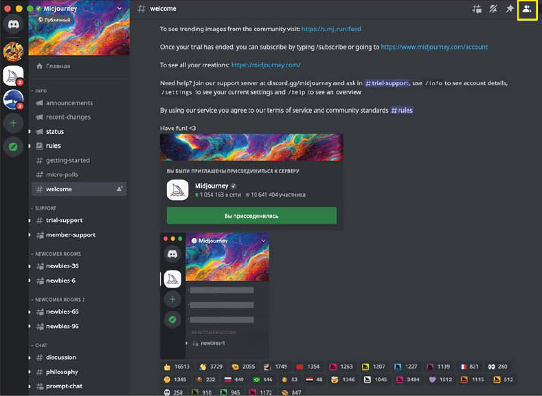 4. Заходите на сервер дискорда по ссылке https://discord.com/invite/midjourney: