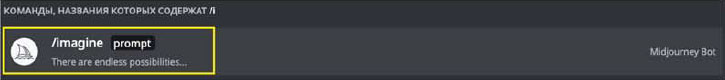 Теперь напишите боту /imagine prompt (когда начнете набирать, бот сам продолжит фразу):