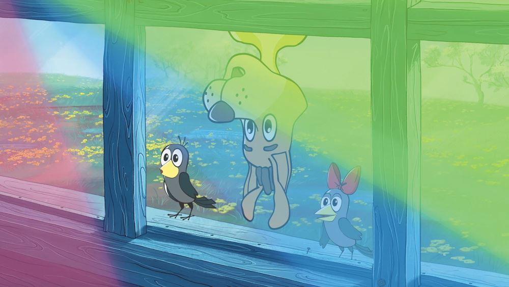 В окно таращились ошарашенные галчата. Рядом с ними возникла голова Шарика. Он так спешил узнать, в чём дело, что не стал спускаться, а просто свесился с крыши.