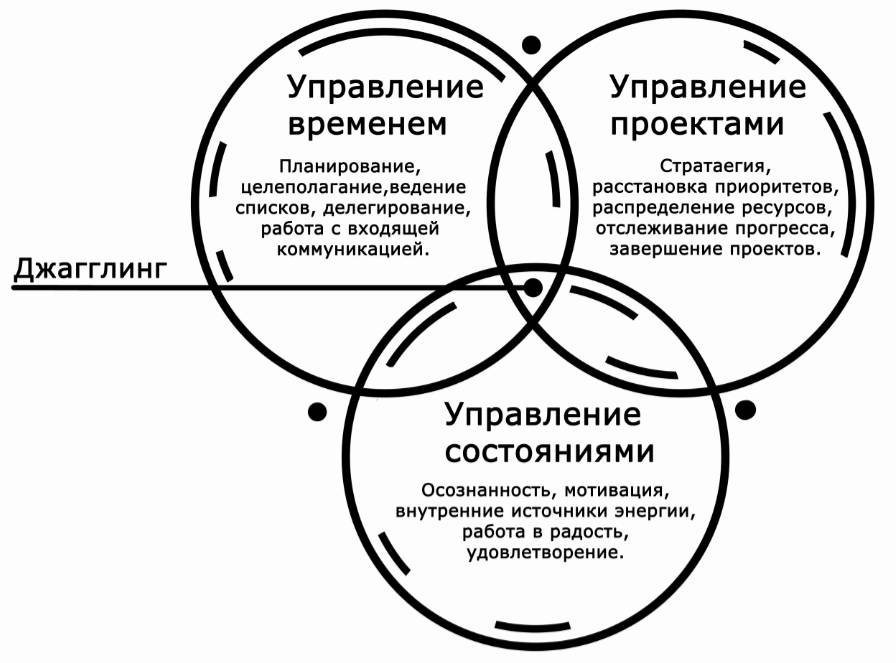 В целом всю систему джагглинга можно представить на схеме ниже (рис.1). Успешная работа по всем фронтам возможна только при объединении усилий, направленных на управление временем, проектами и состояниями.
