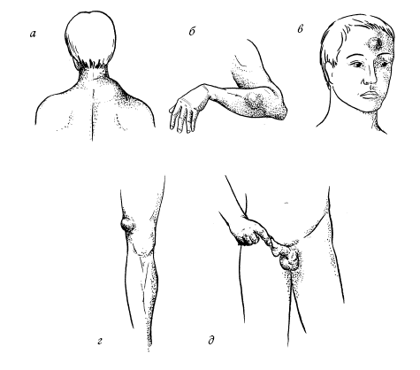 б – на руке; в – на лице; г – на ноге; д – на половом члене