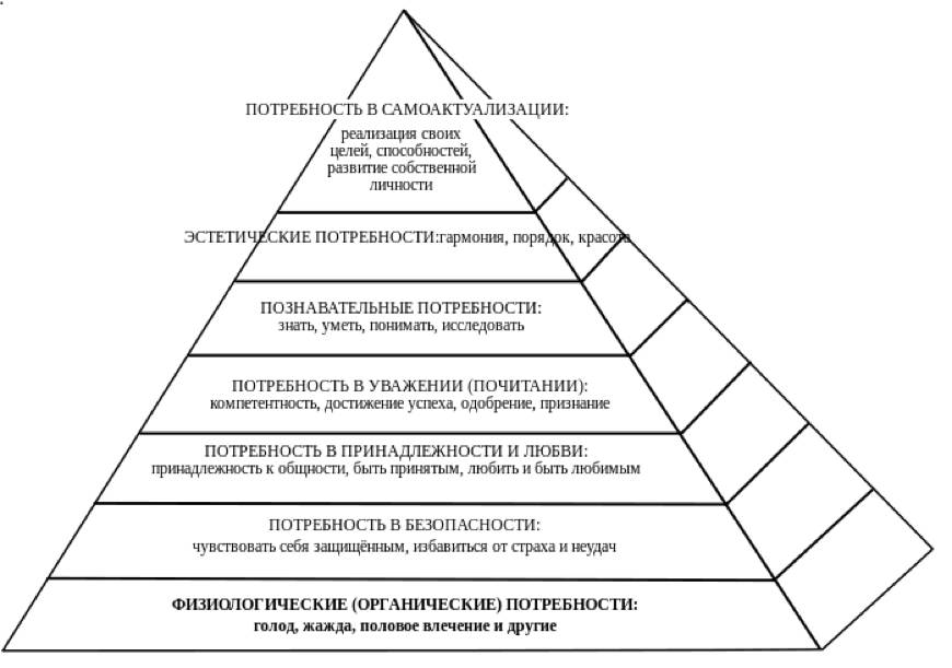 Известный американский психолог, основатель гуманистической психологии Абрахам Маслоу распределил потребности по мере возрастания, объяснив такое построение тем, что человек не может испытывать потребности высокого уровня, пока нуждается в более примитивных вещах. В основании – физиология (утоление голода, жажды, сексуальной потребности и т.п.). Ступенью выше разместилась потребность в безопасности, над ней – потребность в привязанности и любви, а также в принадлежности какой-либо социальной группе. Следующая ступень – потребность в уважении и одобрении, над которой Маслоу поставил познавательные потребности (жажда знаний, желание воспринимать как можно больше информации). Далее следует потребность в эстетике (жажда гармонизировать жизнь, наполнить ее красотой, искусством). И наконец, последняя ступень пирамиды, наивысшая,– стремление к раскрытию внутреннего потенциала (она и есть самоактуализация). Важно заметить, что каждая из потребностей не обязательно должна быть удовлетворена полностью – достаточно частичного насыщения для перехода на следующую ступень.