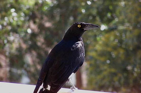 Из своего окна я часто видела сидящую на ветке эвкалипта чёрную птицу с ярко жёлтыми глазами. Она с интересом наблюдала за моим балконом, на котором, в ожидании угощения, примостились попугаи какаду.