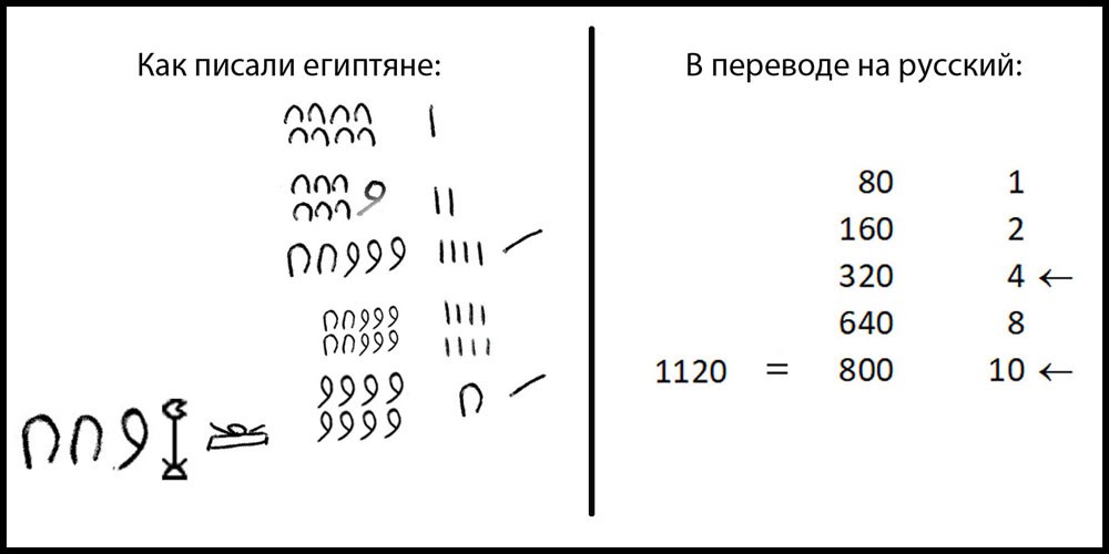 Числа египтяне записывали похоже на известные нам римские числа. Единицы – палочки. Десяток объединяли в символ в виде подковы. Сотню в символ в виде завитка. И так далее. Были символы для тысячи, десяти тысяч, сотни тысяч, миллиона. То есть система счисления у них десятичная, но цифры и, соответственно, позиционная запись числа еще не появляются. (Единицы, кстати, слева, потом десятки и т.д.). В такой системе записи удобно числа складывать (все символы записываем вместе, при необходимости 10 символов одного вида меняем на следующий). И удобно числа умножать на 2 (складывая само с собой). Вычитать (меньшее из большего, конечно) – тоже вполне легко. А большее из меньшего вычитать им не могло и в голову прийти!