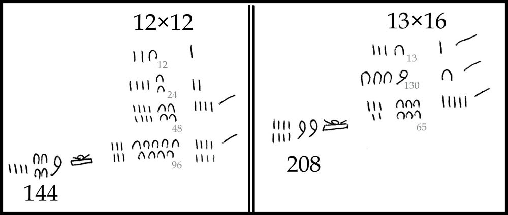 /*При таком умножении очевидно, что коммутативность умножения (то есть то, что от перестановки мест сомножителей произведение не меняется) – штука дааааалеко не очевидная! Чтобы ее заметить, надо быть очень опытным писцом. Практически, математическое открытие!*/