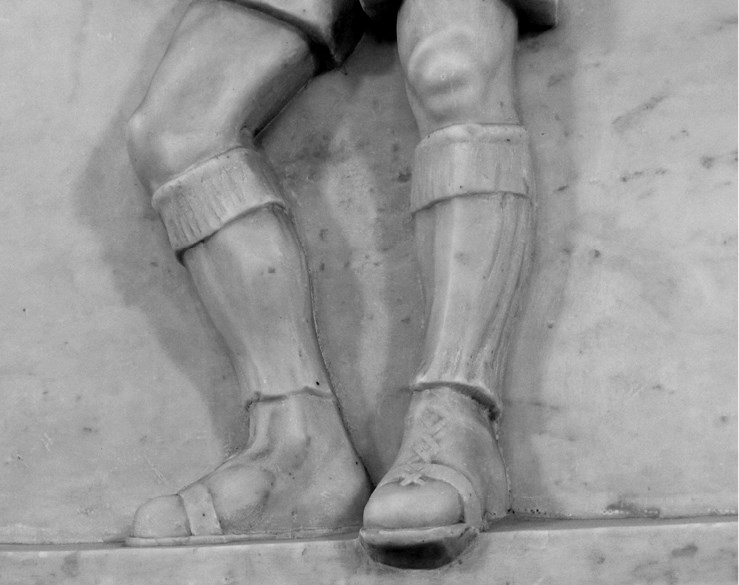Футболист. Фрагмент рельефа на станции метро «Парк культуры. Кольцевая» (Москва) работы И. М. Рабиновича. Стремясь показать специфику этого вида обуви, скульптор акцентирует внимание на шнуровке и полоске, укрепляющей носовую часть ботинка. Фото Екатерины Кулиничевой