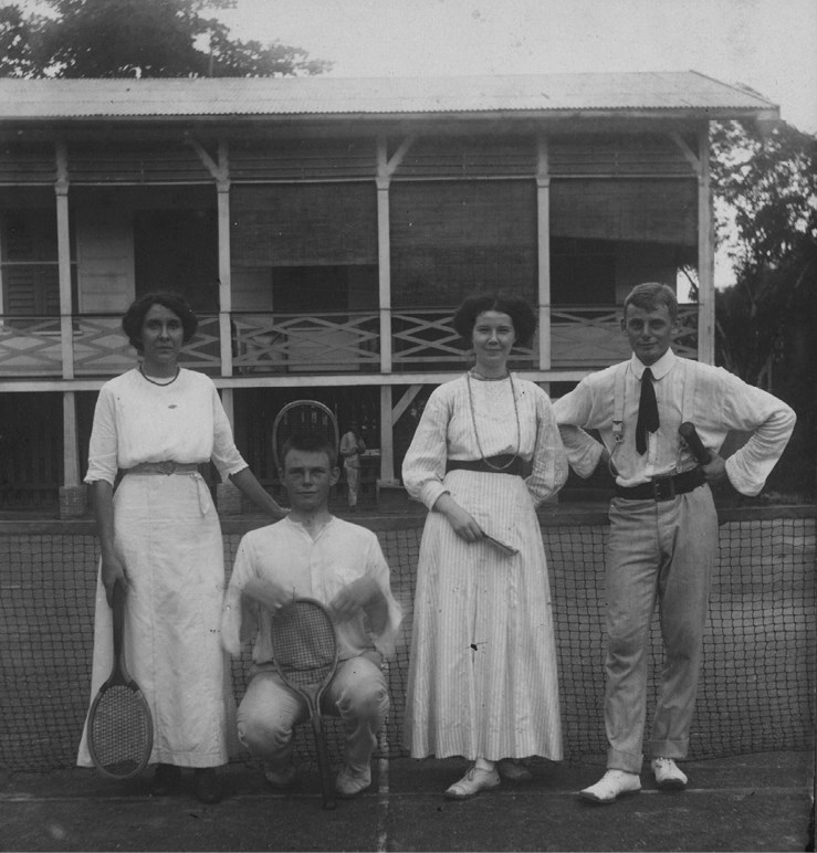 Группа теннисистов на корте в г. Парамарибо (Суринам). 1912. Groepsfoto van vier personen op de tennisclub, anonymous, 1912. Gift of B. Feith-Schnitger, Vorden. The Rijksmuseum