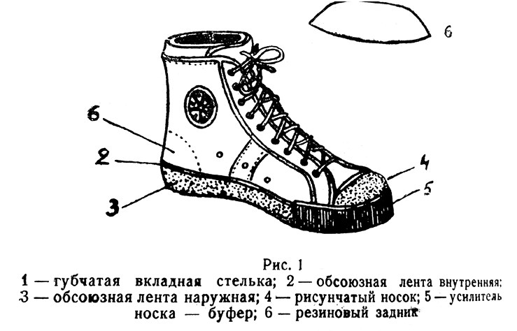Устройство баскетбольной обуви. Схема из книги С. Н. Карнеева и И.П. Арансона. «Спортивная обувь из цветной резины» (М., 1956. С. 2)