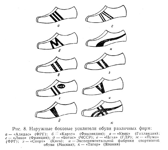 Рисунок наружных боковых усилителей кожаной спортивной обуви, используемых как фирменные идентификаторы разных производителей. Из книги Ф. Д. Кожуховского и Л. Б. Фридмана «Производство кожаной спортивной обуви» (М., 1973. С. 14)