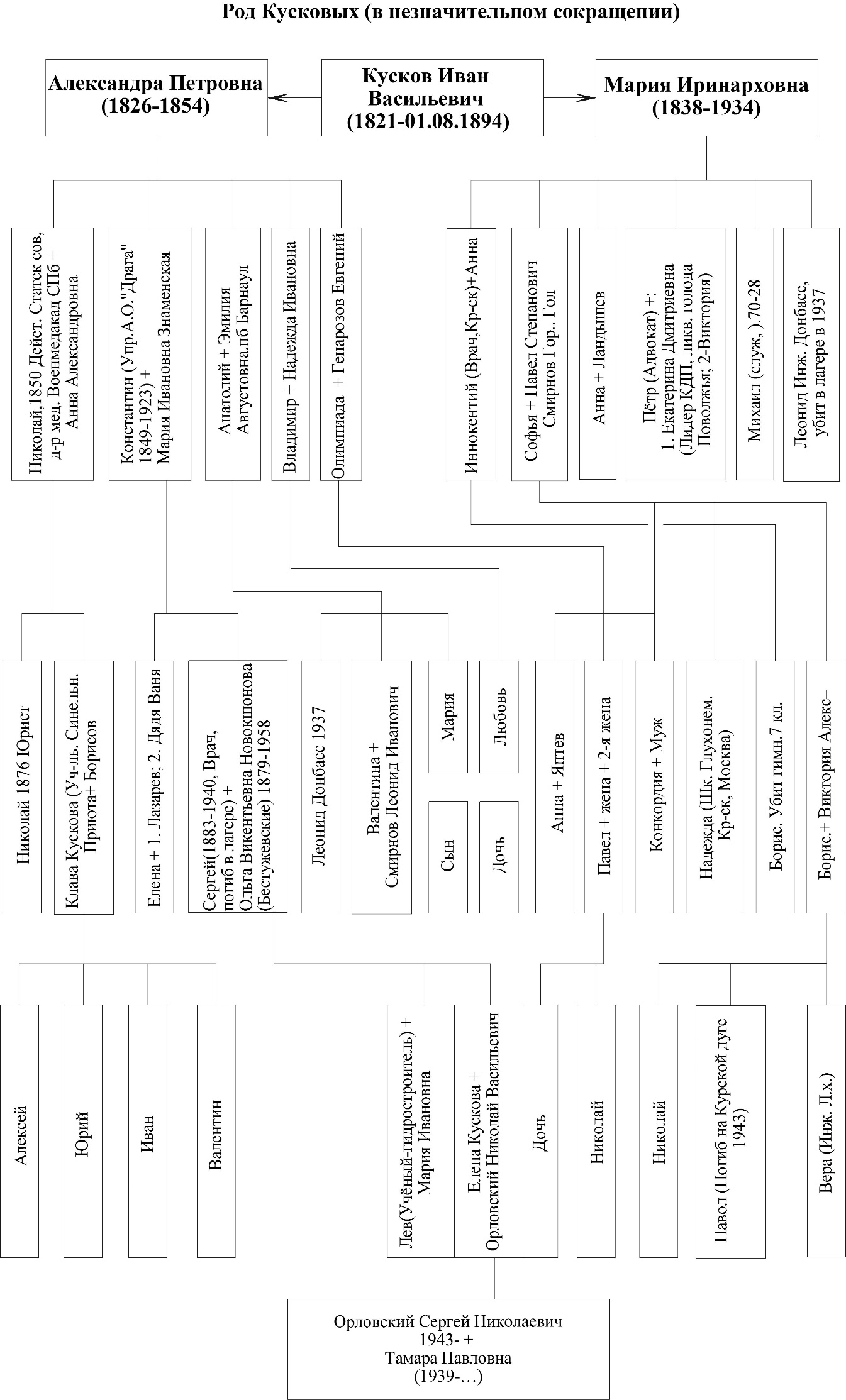 *Схема рода Кусковых, давших фамилию Екатерине, приведена с незначительными сокращениями ниже, его историю можно прочесть в книге – История старинного сибирского рода, изданной на Литрес Самиздат Сергеем Орловским.