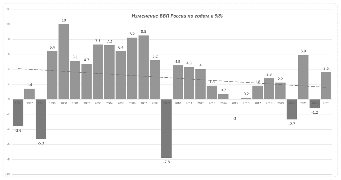 Так, например, можно изобразить изменение ВВП нашей страны по годам, где зеленые столбики – это рост, а красные, соответственно, падение экономической активности.
