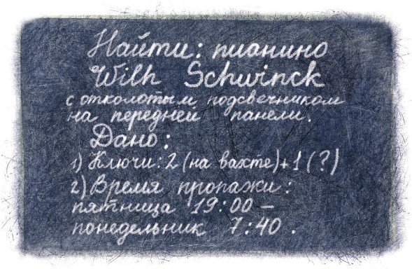 «Найти: пианино Wilh Schwinck с отколотым подсвечником на передней панели.