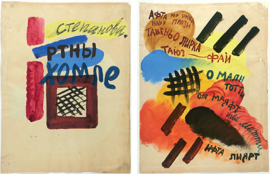 Заумный язык Кручёных и Хлебникова представлял собой отдельные слоги, многосложные «абстрактные» слова и слова из реального языка. Эти три составляющих комбинировались между собой по звуковому ряду – плавному или отрывистому: «дыр бул щыл убещур» или «бобэоби пелись губы, вээоми пелись взоры»{11}. Этот же заумный язык, но уже обоснованный городской суетой и многоголосьем, появился на живописных работах Ольги Розановой как обрывки вывесок и этикеток.