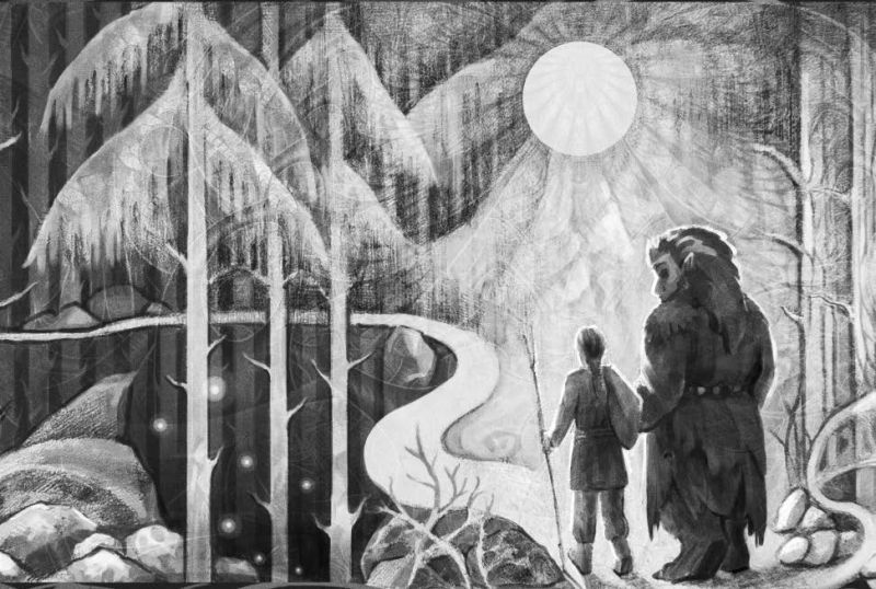 К середине следующего дня Лый и его юный спутник добрались до сердца Южной Тайги, где ели и сосны были невероятной высоты, а их кроны смыкались, будто потолок. Солнечный свет почти не проникал сквозь плотную хвою, и казалось, будто сами стволы вековых деревьев излучают тихий тёплый свет. Земля была неестественно чиста: не было ни валежника, ни кустарников, только лежал плотным слоем хвойный опад, кое-где закрытый снегом.