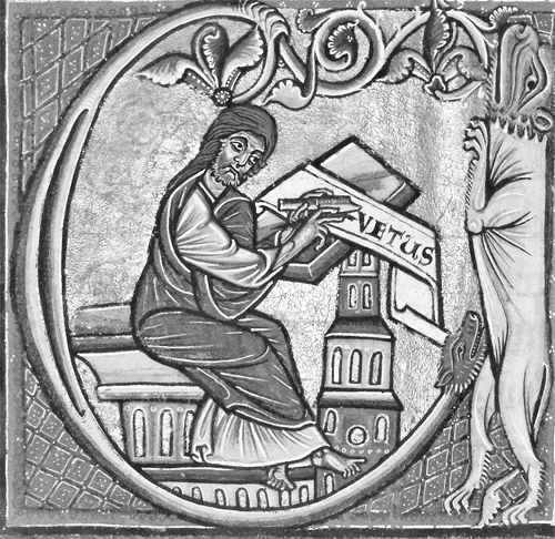 Епископ и два коленопреклонённых клирика. Декрет Грациана. Миниатюра. XIV век