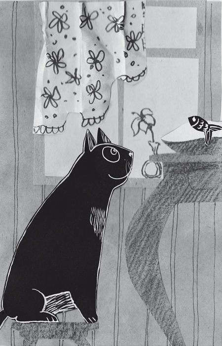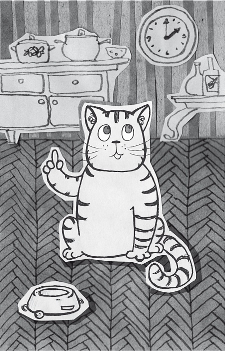 B – кошка смотрит сначала на пол, затем поднимает взгляд на стол или поднос. |_____|