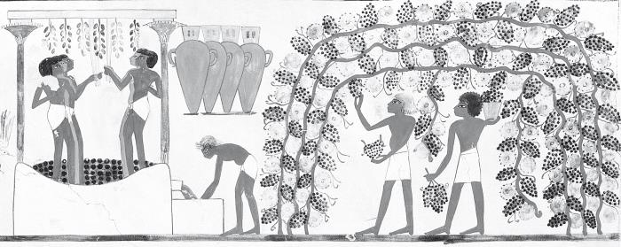 Кстати, на древнеегипетских изображениях вино обычно красного или черного цвета, и это долго считалось доказательством того, что в Египте в основном делали именно красное вино, то есть использовали темный виноград и ферментировали его вместе с кожицей. Но исследования археологических находок показали, что, например, вышеупомянутое вино 5-го года было белым. Так что цвет изображений, вероятно, являлся просто традиционным художественным приемом. Возможно, поначалу делались только красные вина, а белые появились позже, когда уже была сложившаяся традиция изображать вино красным. Заодно отмечу любопытный момент: красные и белые вина были сложены в гробнице Тутанхамона в разных местах, и это, видимо, тоже что-то означало, но что – пока никто не знает.