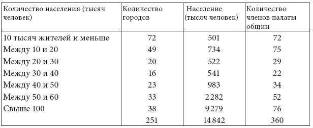 Из списков по городам видно, что 72 небольших города с общим населением в 500 000 человек имеют почти столько же депутатов, сколько 38 крупнейших городов, население которых составляет 9 279 человек. Другими словами, маленькие города имели один мандат на 7 000 человек, а крупные города одного депутата на 122 000 человек. Малые населенные пункты, если вести расчет на основе количества населения, имели примерно в 17 раз больше представителей, чем крупные. Итак, можно сделать вывод, что из 360 членов, положенных городам, половину получали населенные пункты, общее население которых не превышало 1 800 000 человек, а населенные пункты с общим населением свыше 13 000 000 человек вынуждены были согласиться на другую половину[38].