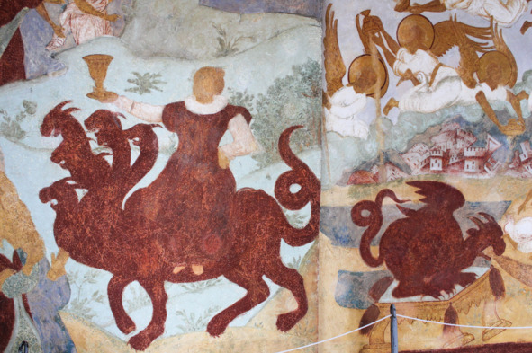 На стенах и сводах изображены не только люди, но и странные животные. Некоторые напоминают смесь чёрта и дракона.