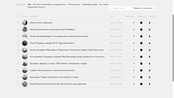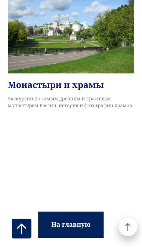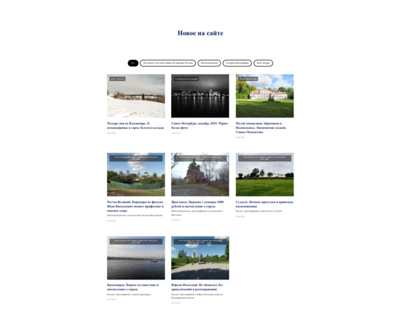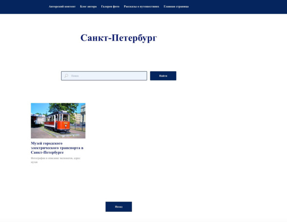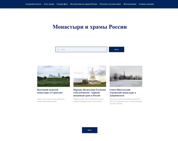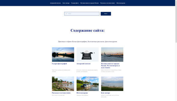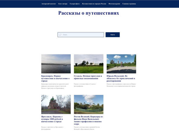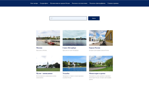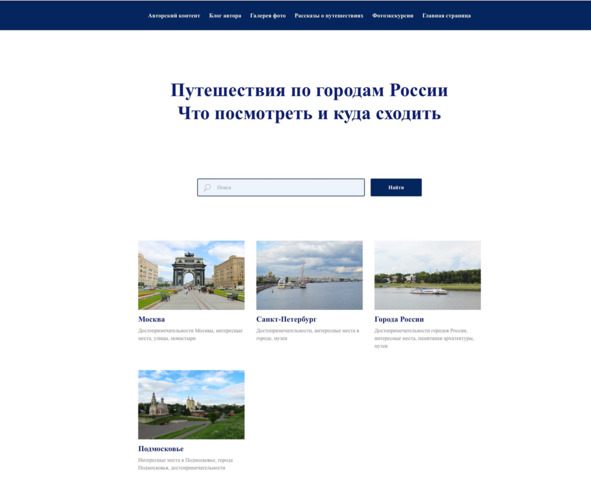 Если перейти по ссылке «Путешествия по России», то откроется соответствующий раздел. На странице я указала список подразделов и не стала дублировать их в меню сверху (мне показалось, что так страница будет выглядеть эстетичной и перемещаться по сайту удобно).