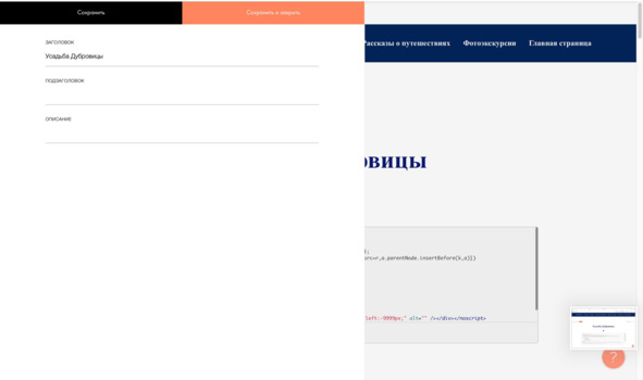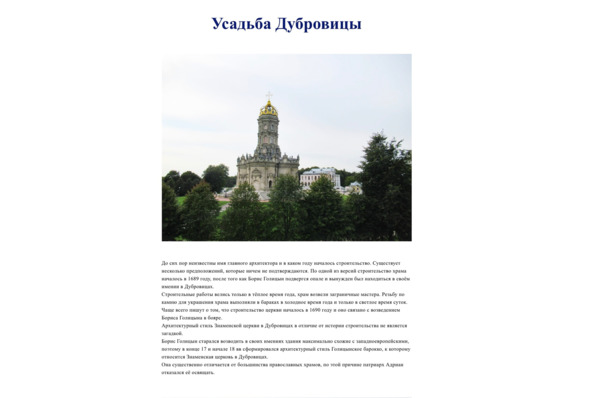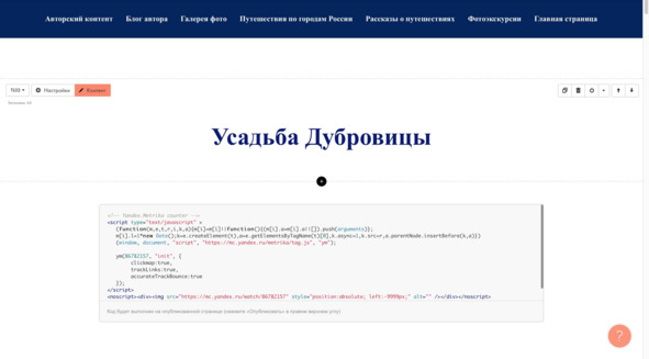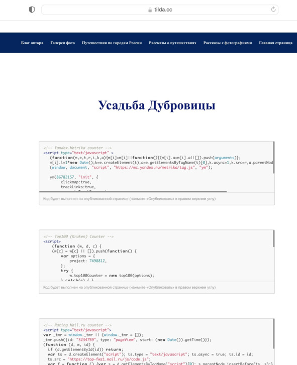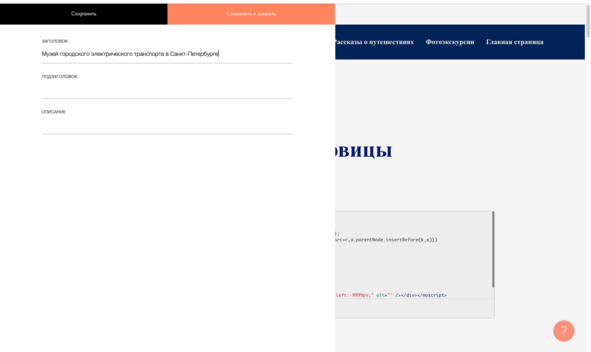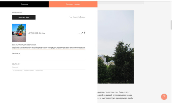 Выбрать необходимый шаблон, Tilda создаст его точную копию, которую можно редактировать. Название тоже копируется, поэтому его надо будет изменить в настройках страницы. Например, мне необходимо сделать страницу для статьи о Музее городского электрического транспорта в Санкт-Петербурге, я выбрала страницу под названием «Усадьба Дубровицы» (я все статьи пишу по этому шаблону), открылась её копия.