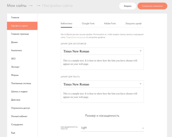 Цвет страниц и шрифта можно выбрать в настройках сайта в разделе «Шрифты и цвета».
