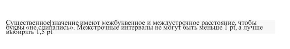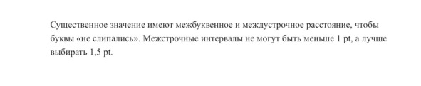 Существенное значение имеют межбуквенное и междустрочное расстояние, чтобы предложения и буквы «не слипались». Межстрочные интервалы не могут быть меньше 20 pt, а лучше выбирать 30 pt.