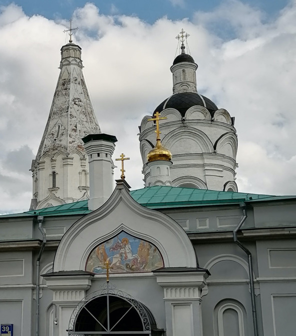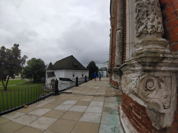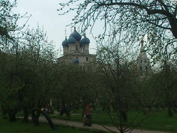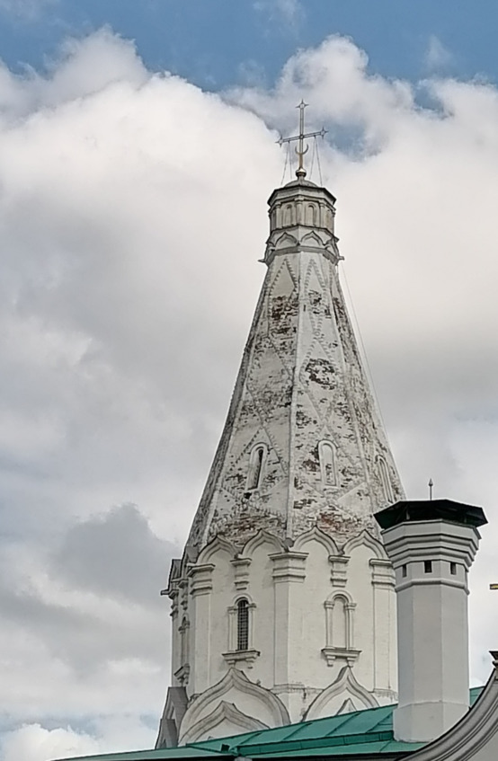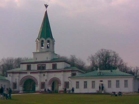 На заднем плане шатровый храм, точнее первый шатровый храм России в Коломенском в Москве.