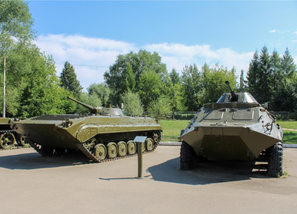 Рядом с БМП-1 установили бронетранспортер. Во время Великой Отечественной войны Советский Союз покупал бронетранспортеры у других стран. Серийное производство БМП в СССР началось в 1947 г.