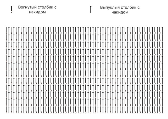 Во втором и последующих рядах чередовать вогнутые и выпуклые столбики с накидом (в начале ряда петли подъёма).