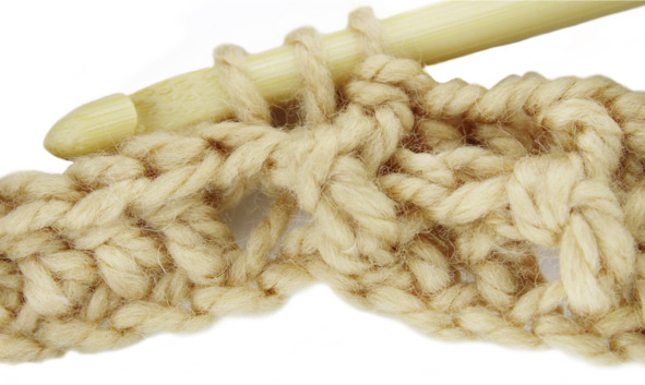 Выпуклый столбик с накидом образуется за счёт обвязывания рабочей нитью столбика с накидом с лицевой стороны полотна.