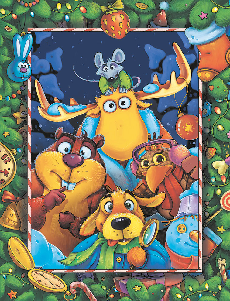 Знаменитые сыщики пёс Фу-Фу и кот Кис-Кис тоже украшали своё Детективное Бюро. Кот развесил под потолком гирлянды, приготовил праздничный салат из сосисок с сосисками, упаковал подарки для всех друзей и в очередной раз выставил за дверь Кролика, который пытался съесть угощения раньше времени. Фу-Фу всё это время разбирал хлам на своем столе. Хлама почему-то не становилось меньше, наоборот, он распространялся по всему Бюро.