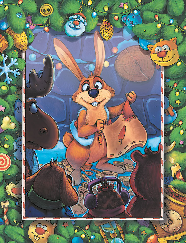 Лось Можжевельник обвесил стены замка разноцветными фонариками. Бобёр Бобрович, воспользовавшись случаем, раскинул неподалёку торговую палатку и принялся продавать всё что ни попадя, называя это «звероновогодними сувенирами». Кролик же, услышав от Бобровича, что скоро наступит Звероновый год, совсем одичал. Он с выпученными глазами бегал от дома к дому, раздавал зверям бестолковые советы и пробовал у каждого праздничную стряпню.