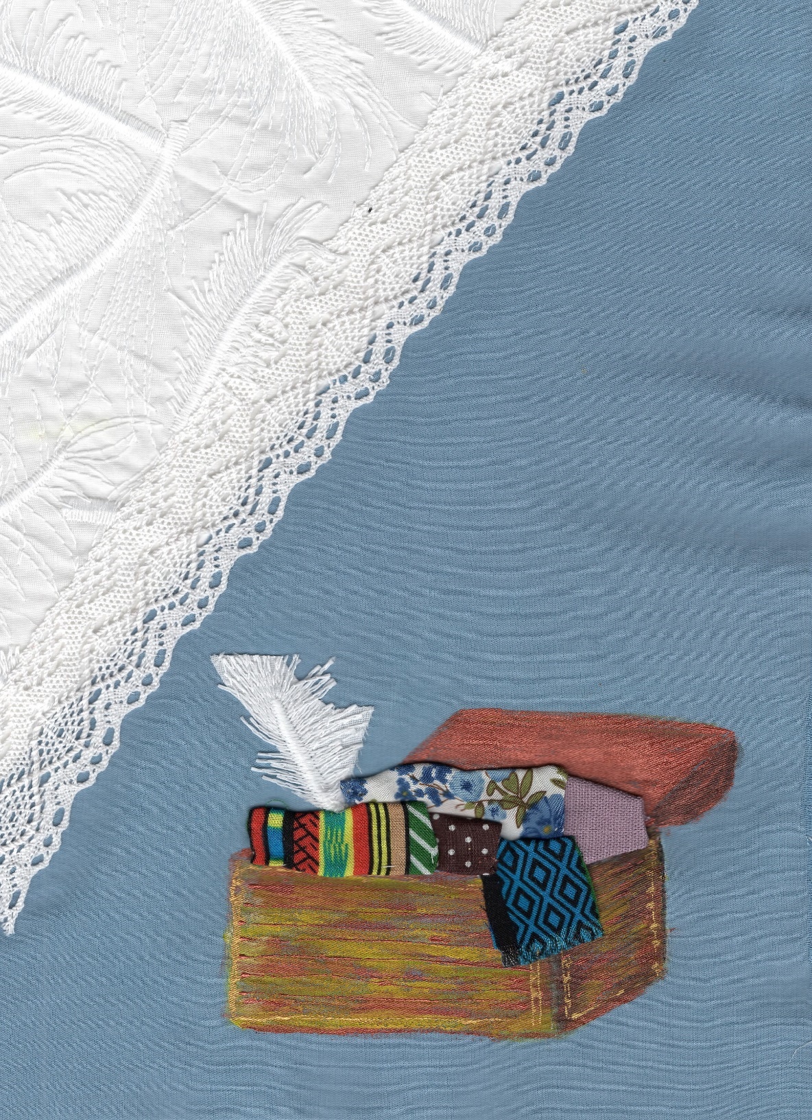 Мама уселась на крылечке – солнце промаслило его насквозь – перья блестели и от лёгкого ветерка слегка пошевеливались в открытом сундуке. Рассматривая их, мама вдруг вздумала сложить из них узор на полу – перья словно сами подсказывали путь. Волшебным образом они цеплялись одно за другое, создавая плотную материю с замысловатым узором…