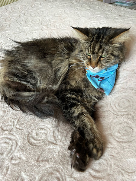 Без сюрпризов не обошлось. Как-то поздним вечером, смотрю, стома у кошки болтается, а потом она и вовсе вышла. Проблем прибавилось, я не представляла, как кормить её из шприца. Пришлось искать индивидуальный подход – мазала ей влажный корм на передние лапы, она его слизывала. По времени это примерно в час по чайной ложке. Но, так она хоть что-то ела, иногда сама к тарелке подходила и ела самостоятельно. Стабильно теряла в весе. В какой-то момент она весила всего 2,7 кг., и это мейн-кун!