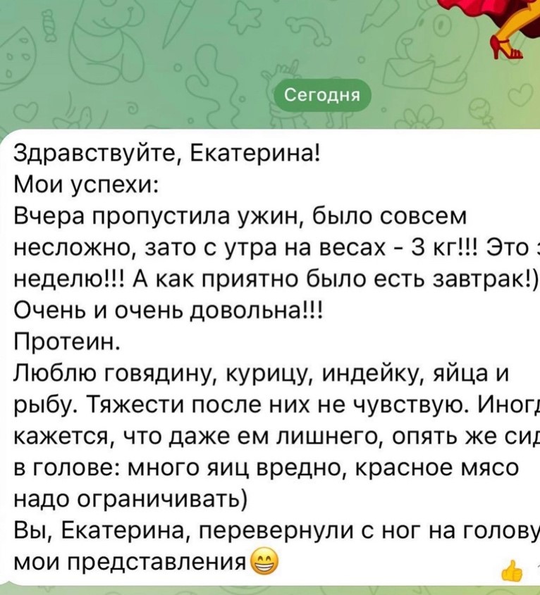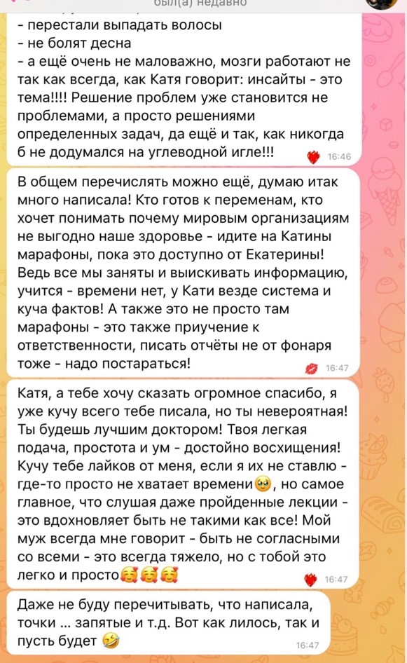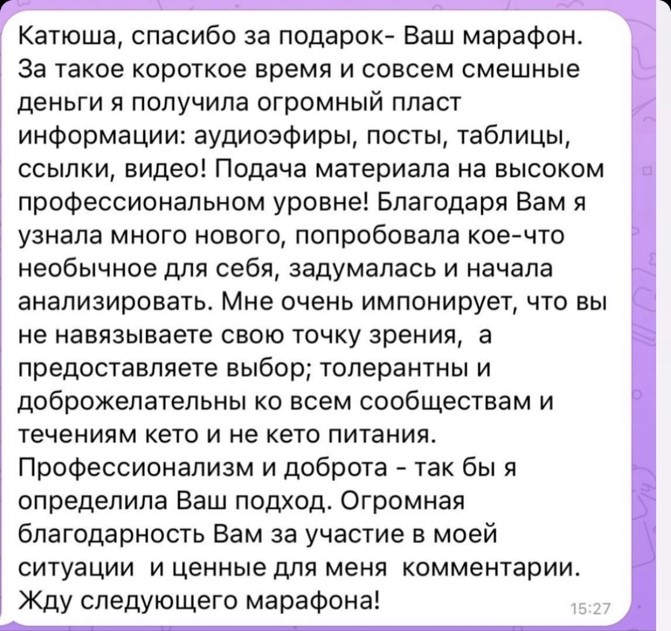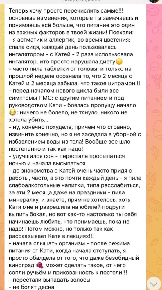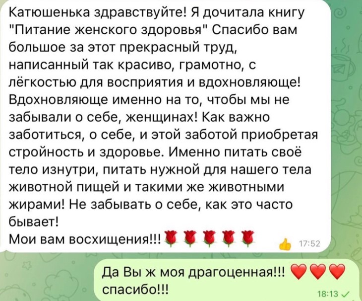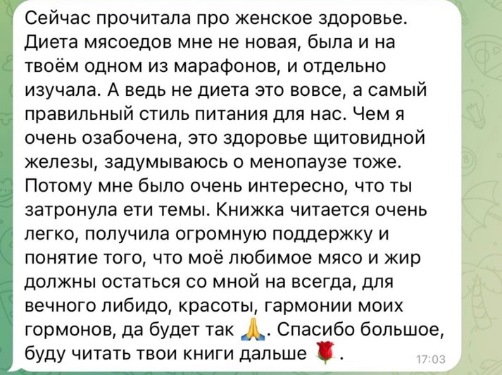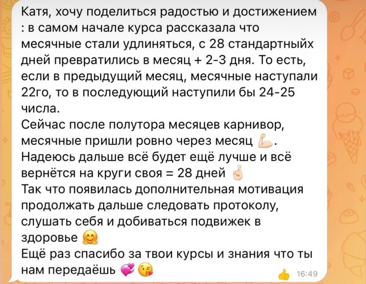 Как вы можете увидеть по отзывам о курсах осознанного питания, особенно про карнивор-питание, среди участниц очевидна тенденция к улучшению гормонального статуса, улучшению стрессоустойчивости, качества кожи, похудению и др.